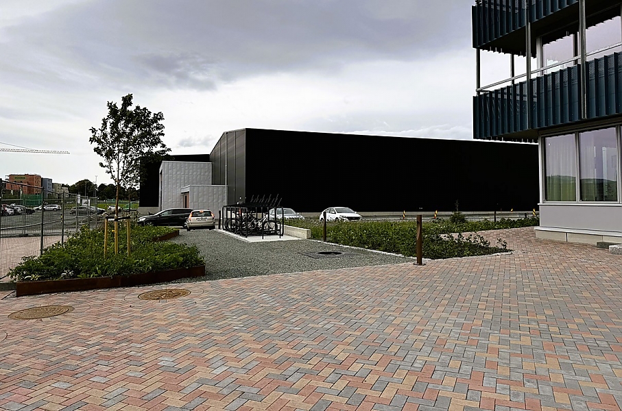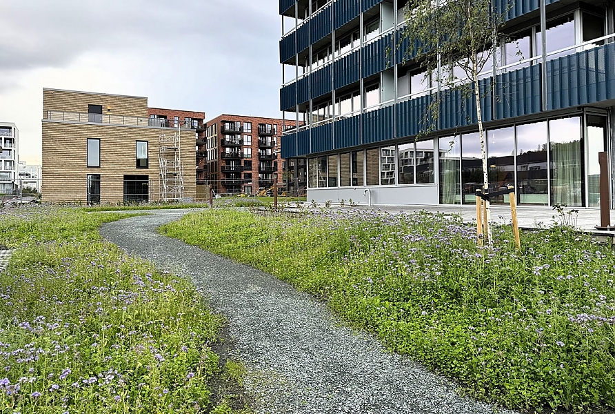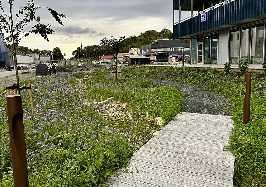 Mot adkomstveien i vest er det etablert en blågrønn sone, som fungerer både som fordrøyningsanlegg og biologisk miljø, med et regnbed fylt med frodige stauder.